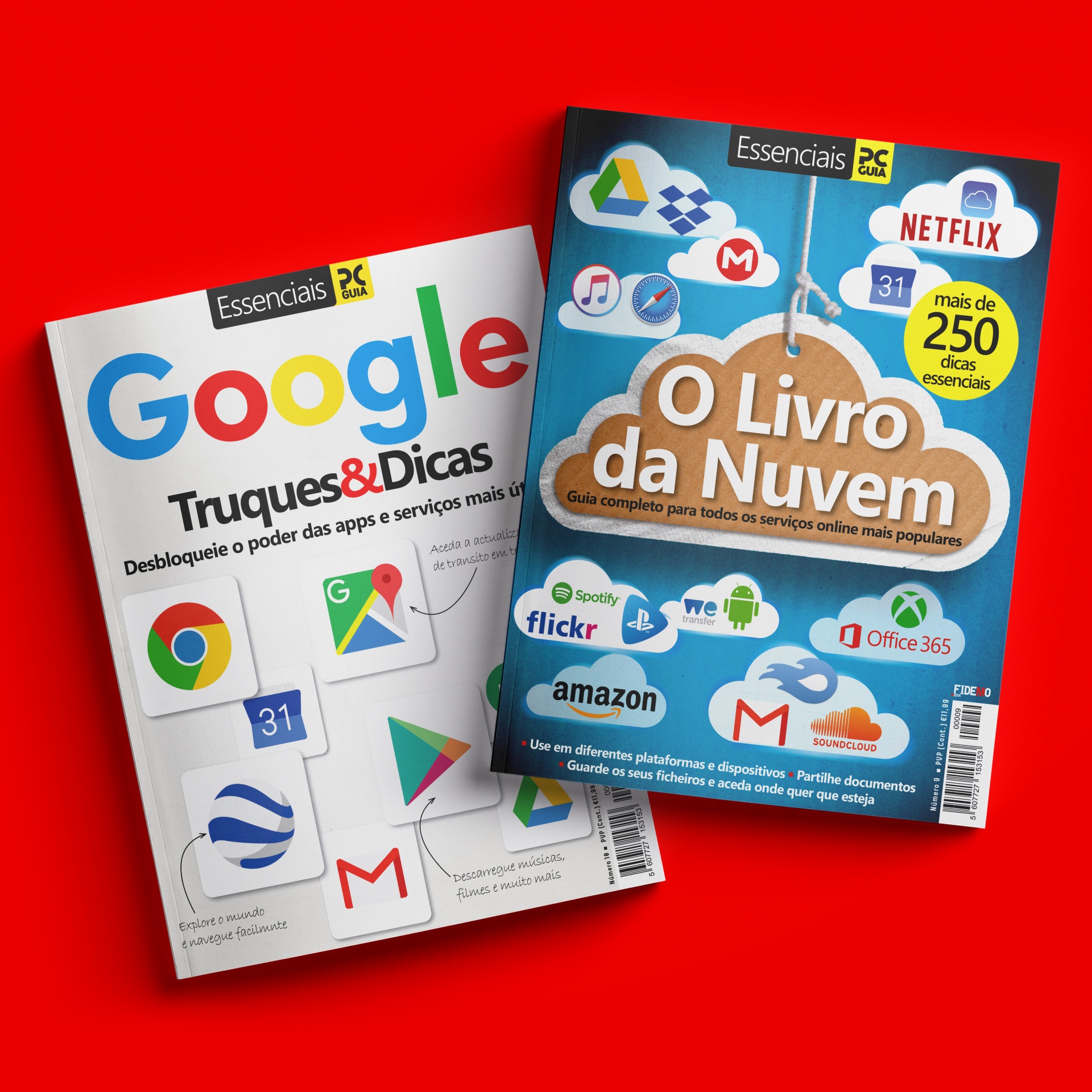 Pack com 2 Livros dos Essenciais PCGuia, Google - Truques & Dicas e Livro da Nuvem. Trata-se de manuais independentes para todos os utilizadores, iniciantes e avançados.